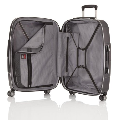 Die neue NOS-Serie Stripes aus 100%Polycarbonat hat einiges zu bieten: Neben dem einzigartigen, geschützten Streifen-Design, welches als deutsches Geschmacksmuster eingetragenwurde, besticht die Serie mit Funktionalität. So ist die sie mit derinnovativen Tarmac-Oberfläche, einem wasserabweisenden Reißverschluss, Zwillingsrädern und einem versenkten TSA-Schloss ausgestattet. Das futuristische Design macht den Stripes zum schicken Reisebegleiter – egal ob privat oder beruflich. Material: Polycarbonat Hauptfach mit Zweiwegereißverschluss herausnehmbares Hemdenfach Trennfach mit RV, seitliches RV-Fach TSA-Schloss 4x360º leichtlaufende Rollen arretierbares Teleskopgestänge Kabinengepäck